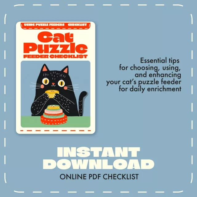 This checklist is ideal for cat owners who want to boost their pet’s mental stimulation, reduce boredom, and encourage healthy eating habits. It’s also great for anyone curious about using puzzle feeders for cats and looking for a simple way to get started with enrichment feeding.